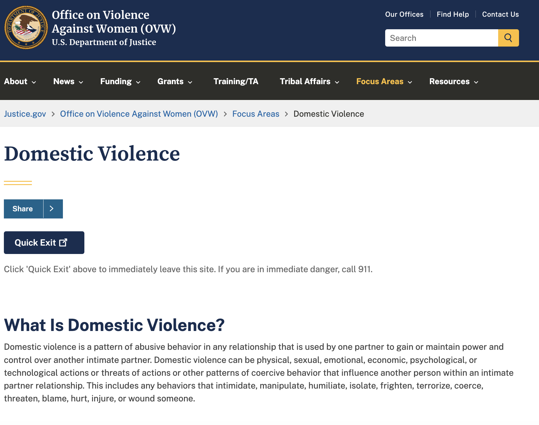 At the time of writing, here’s the definition of domestic violence from the Department of Justice’s Office on Violence Against Women, quoted, and with a screen shot below for posterity: