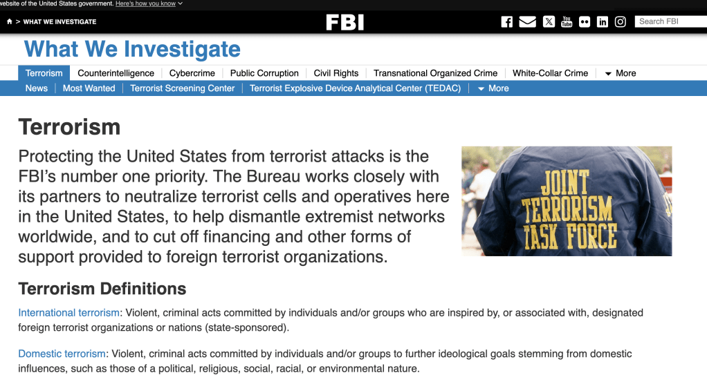 And also at the time of writing, the definition of terrorism from the FBI before inevitably Trump 2.0 changes it, again with a screen shot to help future us remember ‘the way we were’: